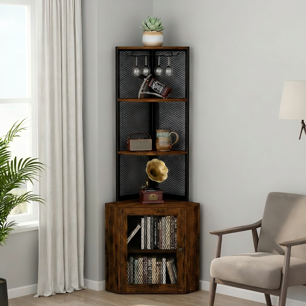 This product can make your space with this 65-inch tall corner cabinet, featuring six spacious tiers, an integrated wine glass rack, and durable wood-and-metal construction. It comes equipped with 2 AC outlets (125V/2A), 2 USB ports (5V/2A), and a 4.9-foot power cord for convenient charging of kitchen appliances, devices, or home bar accessories. The freestanding triangular design fits perfectly in living rooms, kitchens, or dining areas, offering both open display and concealed storage. Ideal for use as a corner bookshelf, liquor cabinet, or multifunctional storage stand to keep your home clean and stylish.